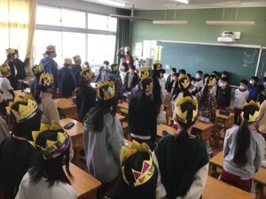 ホーム > 日々の活動の様子 6年生に「ありがとうの会」 2月21日(火)の朝学習時に、1年生各クラスが6年生各クラスに赴き「ありがとうの会」を実施しました。この日までに図工の時間等で作成した冠とメダルを1年生が持参し、それぞれ事前に割りふった相手に渡しました。だんだん「ませてきた」姿も感じられる6年生ですが、この日ばかりは1年生からの贈り物にみんなはにかんだ表情を見せていました。6年生のクラスの中には、最後にお礼として歌を送っていたところもありました。 そしてこの日は、休み時間も授業中ももずっと冠を被ったまま過ごす姿もありました。 タグ:2022年度 シェアする Twitter でシェア はてなブックマークに保存 LINE でシェア Facebook でシェア Pocket に保存 Feedly で購読 関連投稿 日々の活動の様子 餅つき 三雲みんなの図書館コミュカル 新しく入った本 【三雲みんなの図書館コミュカル】 日々の活動の様子 前期役員認証式 日々の活動の様子 交通安全の「のぼり」 日々の活動の様子 2023年あけましておめでとうございます 日々の活動の様子 避難訓練 前の投稿 ミニ運動会 次の投稿 三雲南幼稚園・保育園からのお客さん