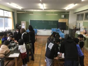 3年、4年、5年、6年生がブースを作り、なかよし班のみんなで周りながらゲームやクイズに挑戦していました。また、今回はCSのみなさんにもブースを作っていただき、子どもたちは「コイン落とし」のゲームを楽しむことができました。