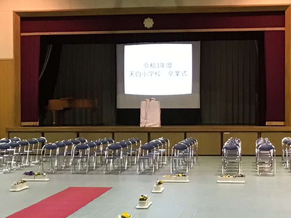 別れの歌や呼びかけは、感染対策のためみんなで声を出すことは控えました。そのため、子どもたちの6年間の成長をまとめたスライドを6年担任が作成し、それに合わせて練習の際に録音した歌「想い出がいっぱい」「旅立ちの日に」を流しました。退場時にはこれまでに担任した先生から花のプレゼントをもらいました。
