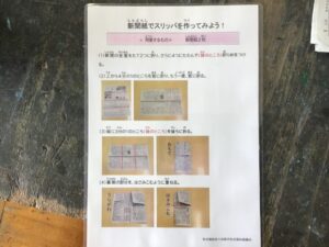 お米を炊いている間に、新聞紙でスリッパを作りました。一足目は説明を聞きながら作りました。2足目は、自分で作ります。出来上がってからは、実際に履いて歩いてみました。地震が起こったときは、ガラスの破片やブロックの破片など危険なものがたくさん落ちています。今回のスリッパ作りを思い出してほしいと思います。