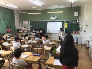 自分たちが店の人に聞いて調べたことをクラスの友だちに紹介しました。タブレットを使い、文章と写真でわかりやすく伝えています。みんなに伝わるように大きな声で話すことも意識していました。また、質問コーナーでは「どうしてそこにできたのですか?」「何人くらいで働いているのですか」など質問をし、答えていました。すぐに答えられるものもあれば、答えられないときも「わかりません。また、お店の人に聞いてみます。」とやり取りができていました。
