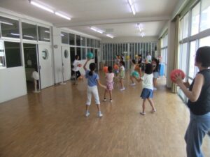「パプリカ」など子どもたちがよく知っている歌や、乗りやすいリズムに合わせ、ボールなどの道具を使って、踊ったり体を動かしたりしました。子どもたちは先生の動きを真似ようと頑張っていました。休憩の時間には「おもしろい!」「楽しい!」という声がたくさん聞こえてきました。