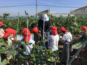 畑では、子どもたちはいちじくの葉っぱのザラザラ感を触って確かめたり、いちじくの香りを感じさせてもらったりしながら、見学をさせてもらいました。「葉っぱ、大きい!」「いちじくって桃みたいな甘いにおいがする!」「いちじくを作ってみたい!」などいろいろな声が聞こえてきました。