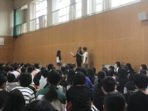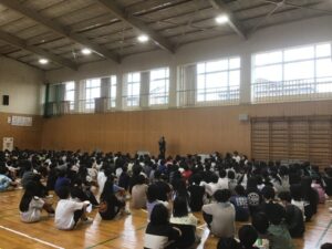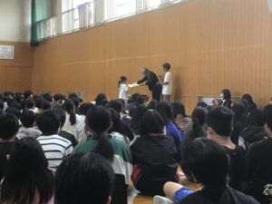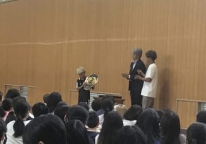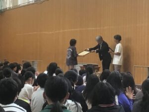 また、伝達表彰も行いました。一人ひとり名前を呼ばれ、教頭先生から表彰状を受け取っていました。水泳、習字、ポスター、キックボクシングの表彰でした。