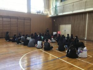ホーム > 日々の活動の様子 おはなし会(4年・5年・6年生) 11月10日(月)、昼休みの時間、三雲おはなし会ピーターラビットの方々に来ていただき、4年生から6年生を対象としたストーリーテリングをしていただきました。絵本や紙芝居などを使わずに、話し手の言葉だけでお話を伝えます。体育館という広い場所でのストーリーテリングということで、途中から入ってきた子どもたちは足音を立てずに、お話の邪魔をしないように気を付けて参加していました。 参加した子どもたちは、お話の世界にすっと吸いこまれていくようでした。 シェアする Twitter でシェア はてなブックマークに保存 LINE でシェア Facebook でシェア Pocket に保存 Feedly で購読 関連投稿 日々の活動の様子 とまとーずさんと交通安全教室 日々の活動の様子 イチジクの観察 日々の活動の様子 6年社会見学⑤ 日々の活動の様子 3年生 えだまめの収穫 日々の活動の様子 前期終業 日々の活動の様子 修学旅行 その11 前の投稿 みんなで楽しく過ごそう(6年生) 次の投稿 なかよし班出会いの会(後期)