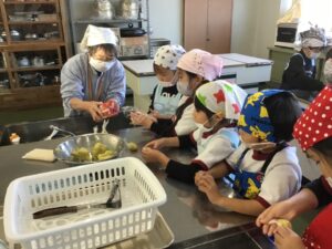 子どもたちは、さつまいもの皮をピーラーで順番にむいていきます。皮をむいたさつまいもをボランティアさん達が手際よく切ってくれました。鍋に水を入れたり、さつまいもを一つずつ鍋に入れたりする仕事は、子どもたちが進んで取り組んでいました。ぐつぐつと鍋を見ながら「いいにおいがしてきた」「さつまいもの色が変わってきた」と調理しながらたくさんの発見がありました。鍋で煮たさつまいもをつぶしながら、砂糖、バター、牛乳を入れて混ぜ合わせました。最後にラップを使って、さつまいもの形を整えました。