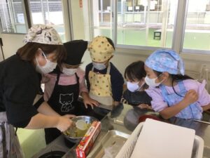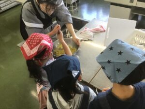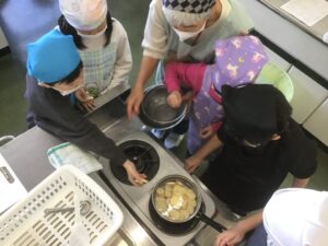 1年生の子どもたちは、初めての家庭科室での調理を楽しみ、おいしく食べることができました。CSボランティアのみなさんにもお世話になりました。