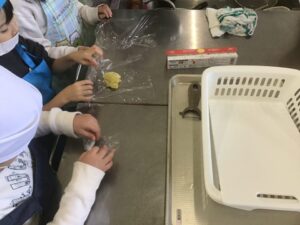 1年生がいなずま会の畑で収穫させていただいたさつまいもを使って、「さつまいもの茶巾しぼり」を作りました。