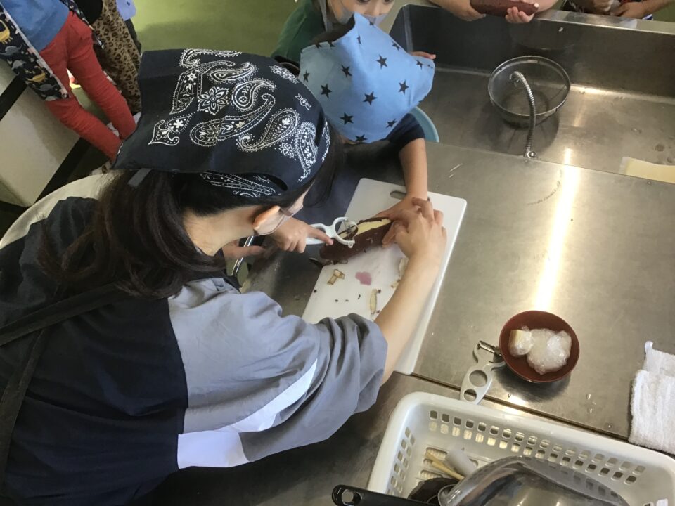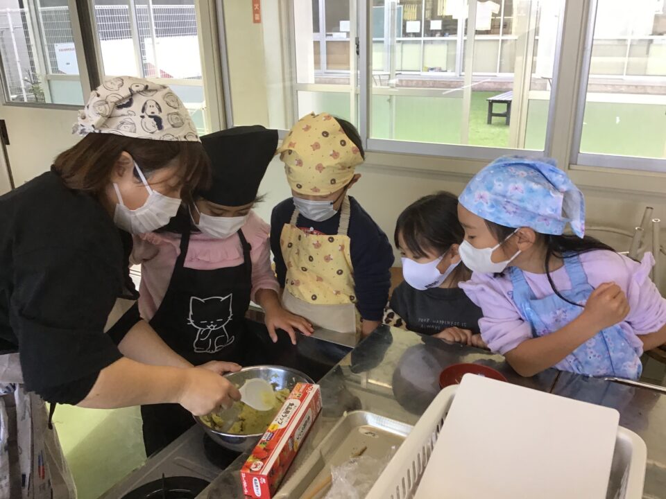 子どもたちは、さつまいもの皮をピーラーで順番にむいていきます。皮をむいたさつまいもをボランティアさん達が手際よく切ってくれました。鍋に水を入れたり、さつまいもを一つずつ鍋に入れたりする仕事は、子どもたちが進んで取り組んでいました。ぐつぐつと鍋を見ながら「いいにおいがしてきた」「さつまいもの色が変わってきた」と調理しながらたくさんの発見がありました。鍋で煮たさつまいもをつぶしながら、砂糖、バター、牛乳を入れて混ぜ合わせました。最後にラップを使って、さつまいもの形を整えました。