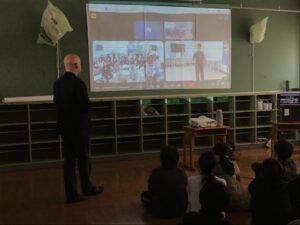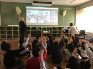 5年生では、日本の各地域の食べ物のことや学校の様子について英語で紹介しました。「好きな色はなにですか?好きな食べ物はなにですか?」と台湾の小学生から質問されると、天白小の子どもたちも進んで英語で答えることができていました。また、じゃんけんタイムやダンスでは、画面越しでしたが大変盛り上がりました。