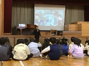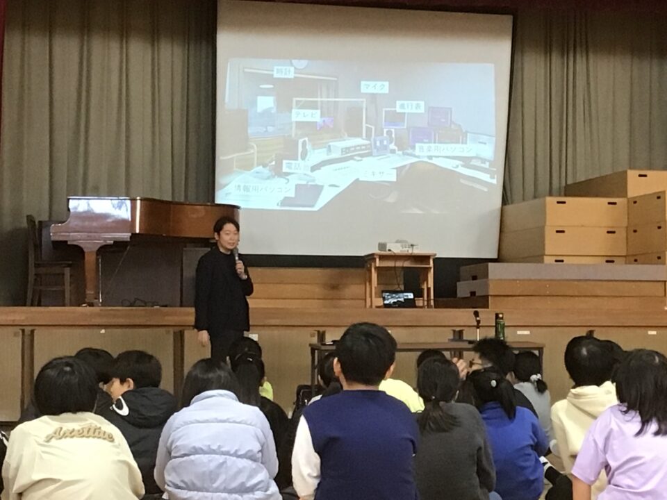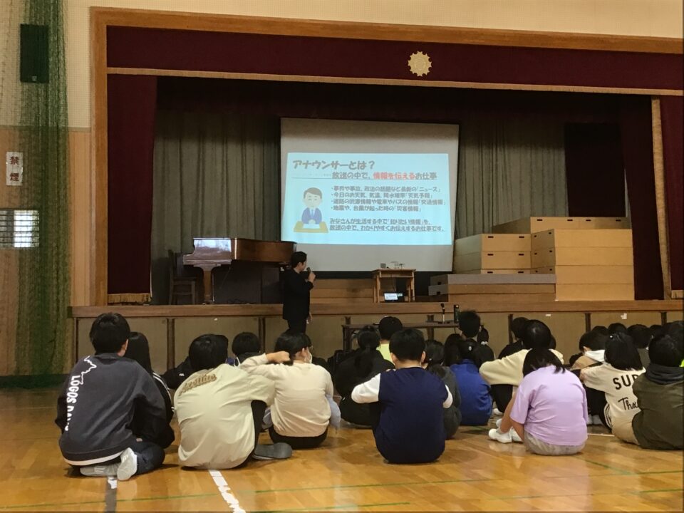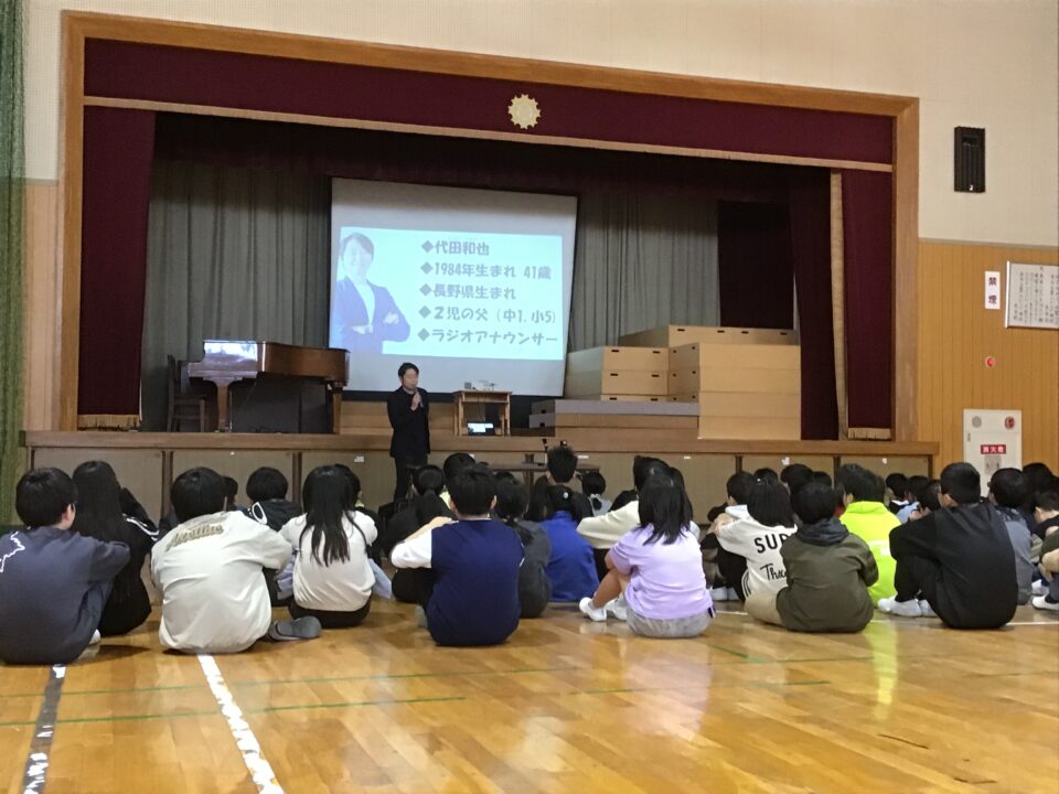 まず、代田さんから自己紹介をしていただき、アナウンサーとはどんな仕事なのか、ラジオアナウンサーはどんな一日を過ごしているのか、ラジオはどんなところで作られているのか、ラジオ番組や放送内容、取材の仕方や取材の段取り等を考えていくうえで大切にしていることなどを聞かせていただきました。子どもたちからは、ラジオの制作に関わる方からのお話、さらにはラジオパーソナリティーさんの素敵な声にうっとりしながらも真剣に耳を傾けていました。