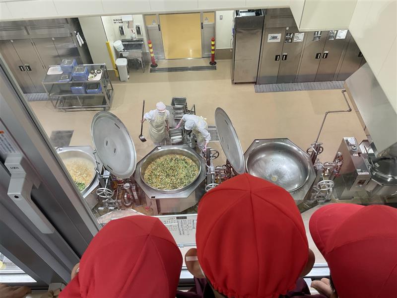 栄養教諭の先生から、北部給食センターでは、35人の調理員さんが約3300人分の給食を作っていることを教えてもらいました。手洗いの仕方や野菜がどうやってセンターまで届くのか、野菜を3回洗っていることなどに驚いている子どもたちでした。また、大きな鍋を紹介してもらい、「これを使って給食を作るのは大変だね。」「すごく力のいる仕事だね。」と話していました。見学が終わってから、「調理員さんにありがとうって言って食べたいね。」「残さずに食べられるようにしよう。」と毎日おいしい給食を作ってくださっている調理員さんへの感謝の気持ちが、子どもたちの心にしっかりと残った一日になりました。
