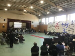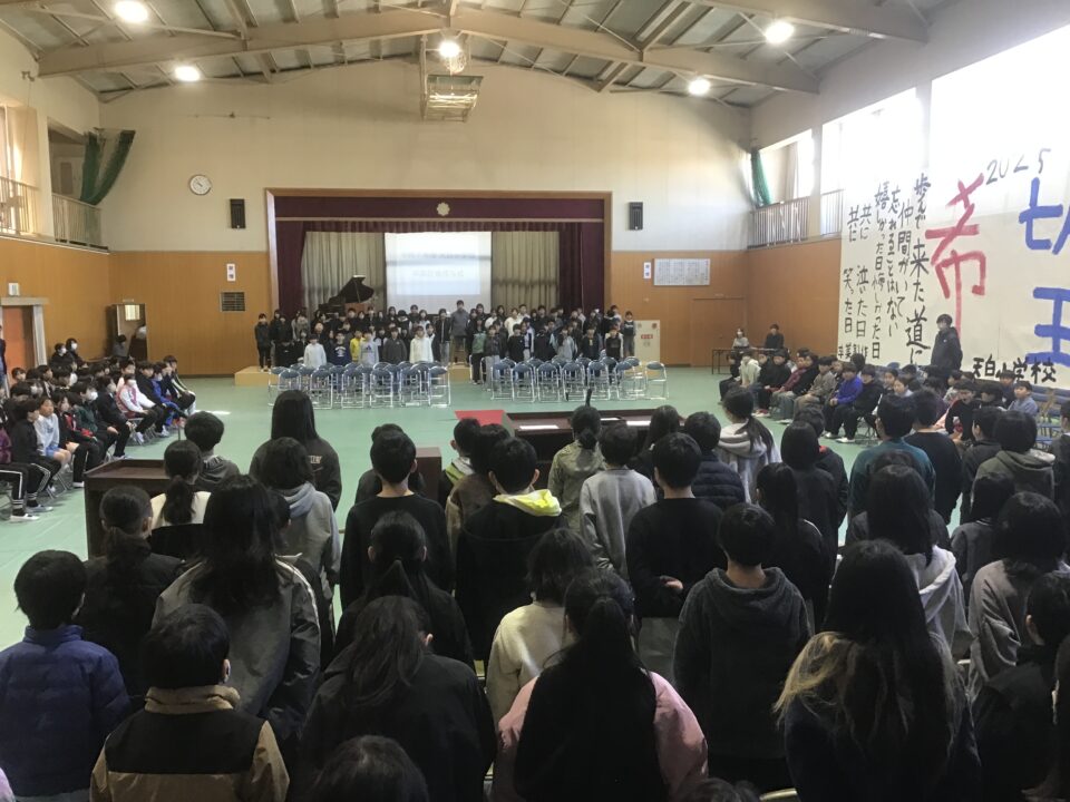 ホーム > 日々の活動の様子 卒業式に向けて(予行練習) 来週の18日(水)の卒業式に向けて、総練習(リハーサル)を行いました。 この日までに各クラス・各学年で練習してきたことを初めから通して実際の動きを確認しながら行いました。今回は、4年生の子どもたちも卒業式練習に参加しました。卒業証書も一人ずつ手渡しをし、もらい方・歩き方・証書ホルダーの持ち方等の練習ができました。 呼びかけや歌は、日に日に素敵な仕上がりになっています。本番まで体調を整え、声をしっかり出せるようにしてほしいと思います。 <入場> <卒業証書渡し> <呼びかけや歌> シェアする Twitter でシェア はてなブックマークに保存 LINE でシェア Facebook でシェア Pocket に保存 Feedly で購読 関連投稿 日々の活動の様子 チューリップのきゅうこんをうえたよ(1年生) 日々の活動の様子 フォトフレームを作ろう(6年生) 日々の活動の様子 新しい年、自分の目標を立てて・・・ 日々の活動の様子 教室から(6年生) 日々の活動の様子 修学旅行 その7 日々の活動の様子 後期役員認証式 前の投稿 教室から(3年生)